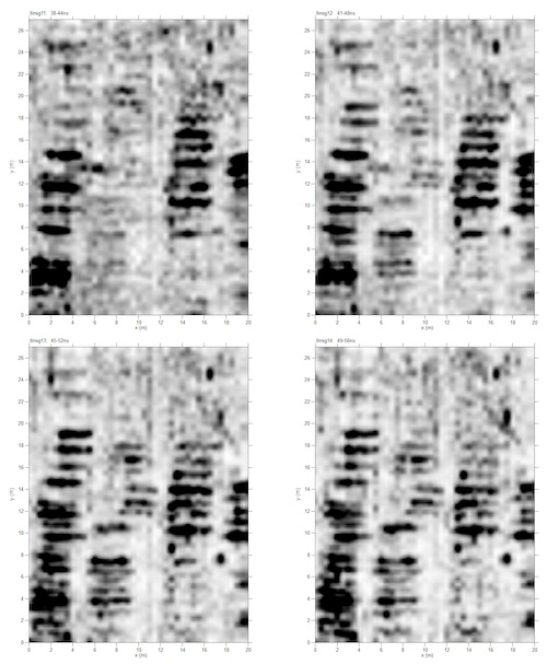 Fig X. – Example depth slices from the same site taken from four depths showing graves from a “western style” burial site. Rows of dark features indicate individual graves.